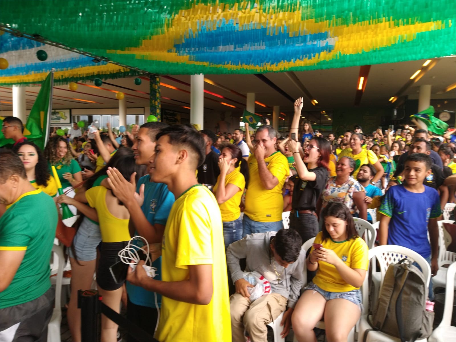 Torcedores se vestiram com as cores verde, amarelo e azul e lotam a área externa de um shopping em Boa Vista onde foi instalado um telão que exibe o jogo de estreia da Seleção Brasileira na Copa do Catar contra a Sérvia na tarde desta quinta-feira (24), em Boa Vista.