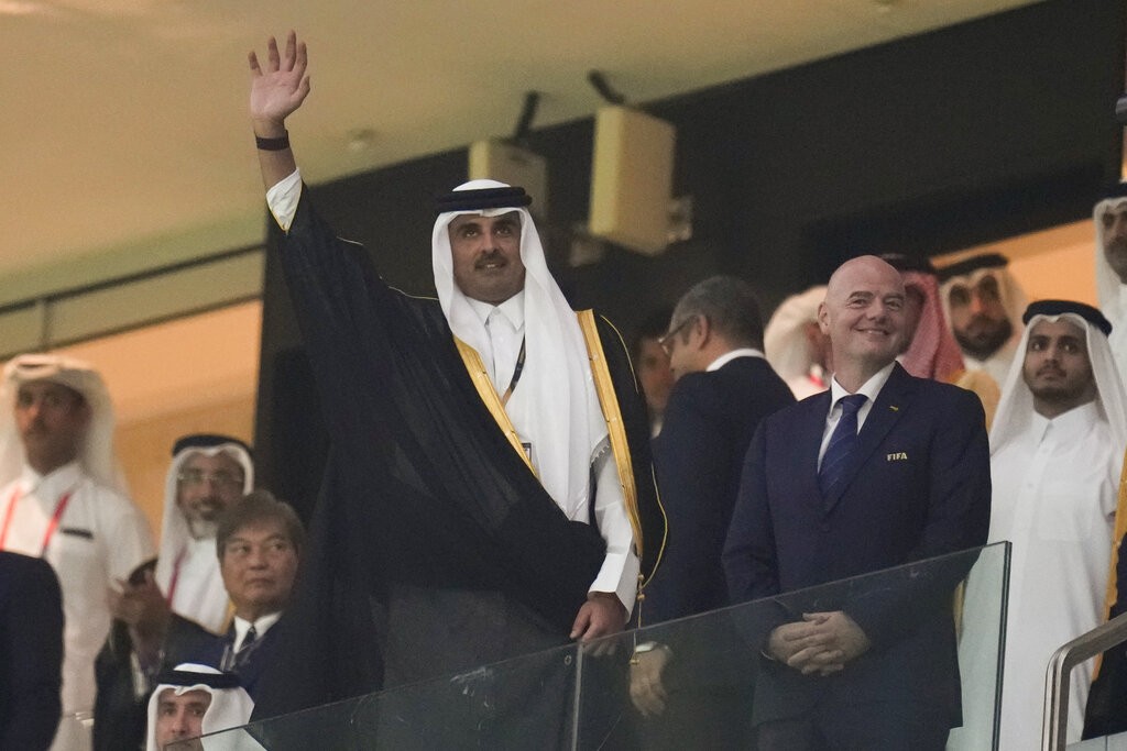 Emir tenta polir imagem do país e desviar para o esporte o foco da intolerância que caracteriza a monarquia autocrata em relação a imigrantes, mulheres e homossexuais. Ao lado do presidente da Fifa, Gianni Infantino, o emir do Catar, Tamim bin Hamad Al Thani, acena para o público durante a abertura da Copa de 2022, em 20 de novembro de 2022.