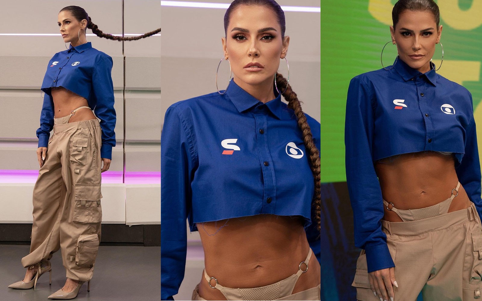 Um dia antes, em sua estreia no programa, a atriz optou por uma camisa cortada, que deixava a barriga à mostra, e uma calça caqui combinando com uma calcinha aparente.
