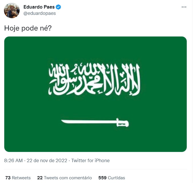 Prefeito do Rio de Janeiro, Eduardo Paes (PSD) postou em sua conta no Twitter a bandeira da Arábia Saudita minutos depois do segundo gol do time sobre a Argentina de Lionel Messi.