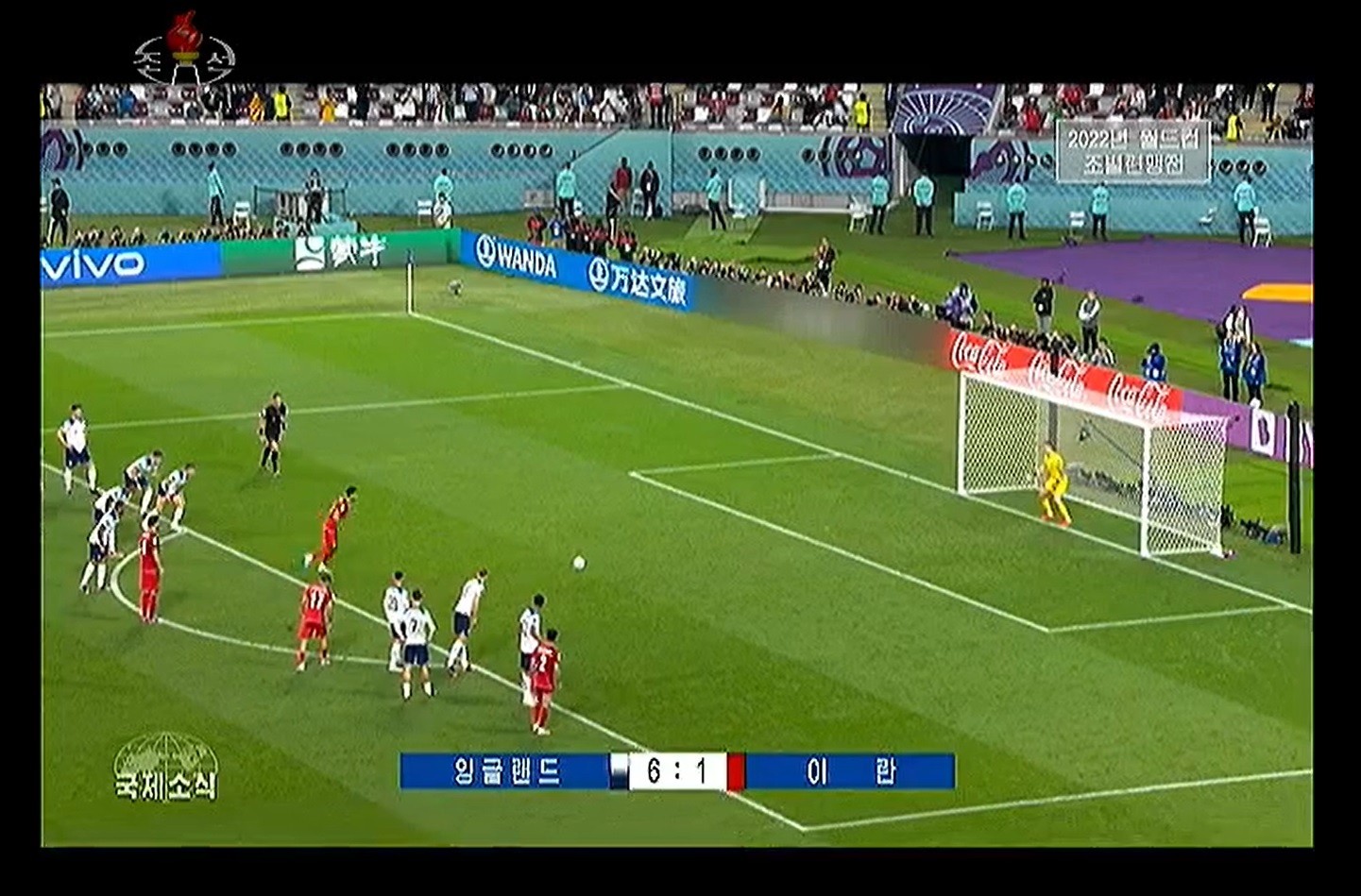 Tradicionalmente, os jogos de futebol demoram semanas para passar na TV norte-coreana (as transmissões são feitas pela estatal KCTV). No entanto, o jogo de abertura da Copa deste ano, entre o Catar e Equador, foi exibido na terça-feira (22), apenas dois dias depois da partida. Trecho de Inglaterra x Irã com publicidade borrada ao fundo na TV norte-coreana KCTV
