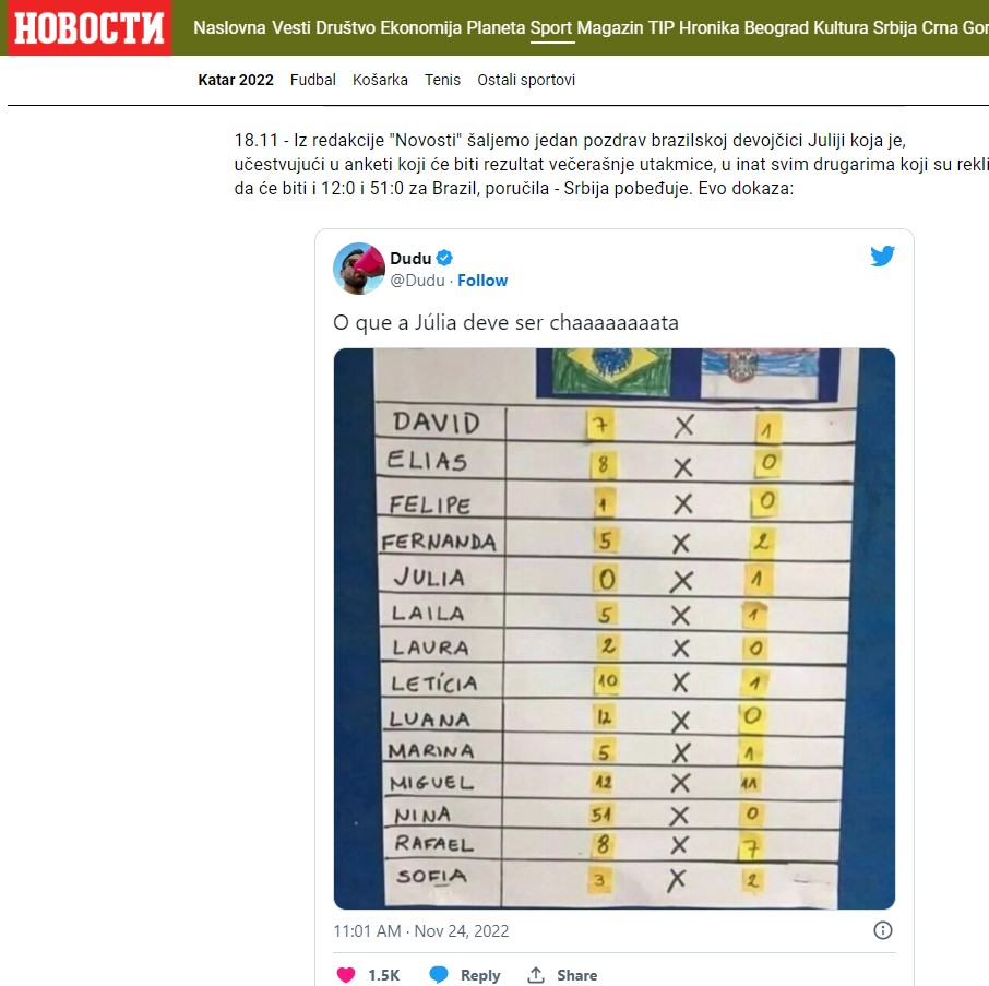 A redação do “Novosti” fez uma brincadeira com meme brasileiro. Circula nas redes sociais no Brasil a imagem do que parece ser um quadro com palpites para o jogo feitos por criaças de uma escola. Em meio a placares exagerados a favor do Brasil, como 51 a 0, uma única aluna, de nome Julia, afirmou que os sérvios vão ganhar.