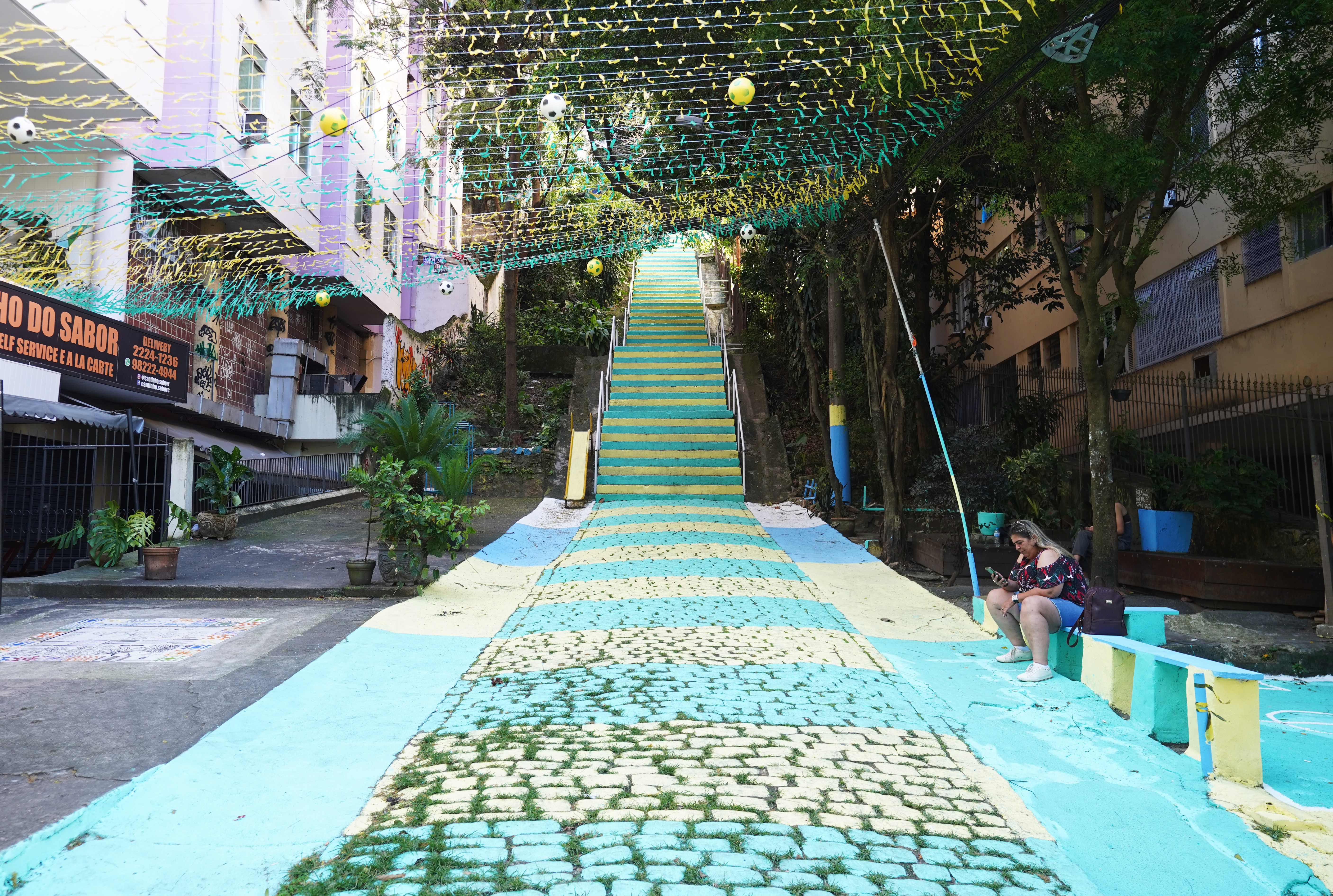 A escadaria verde e amarelo da Rua do Fialho, na Glória, Zona Sul do Rio