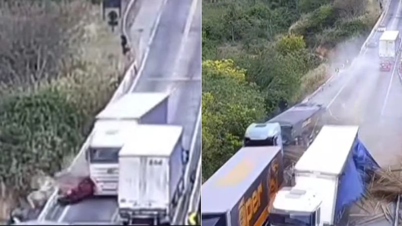 Segundo a Polícia Rodoviária Federal (PRF), o acidente aconteceu pouco antes das 15h. Um caminhão aparentemente sem controle bateu no fundo de um carro vermelho, que foi jogado para fora da via. Aparentando não conseguir frear, ele tenta desviar mas se choca em outra carreta. O veículo caiu de um morro depois.