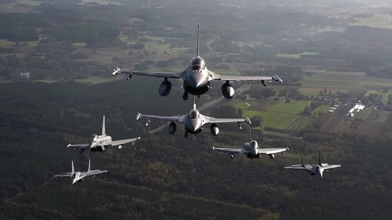A linha de aeronaves incluía Eurofighters italianos, F-16 poloneses e MiG-29 poloneses, além de F-22s dos Estados Unidos.